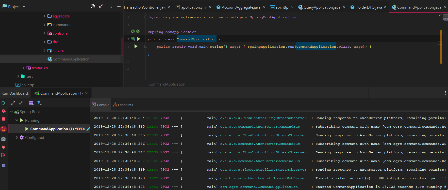 1. AxonServer가 기동된 상태에서 Command App을 수행합니다. 혹시 Axon Server 기동 방법이 궁금하신 분은 AxonServer 설치 및 실행 포스팅을 참고 바랍니다.