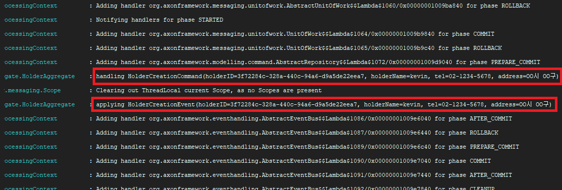 또한 위 그림과 같이 Application 로그에도 정상적으로 CommandHanlder 및 EventSourcingHandler 메소드가 수행된 것을 확인할 수 있습니다.