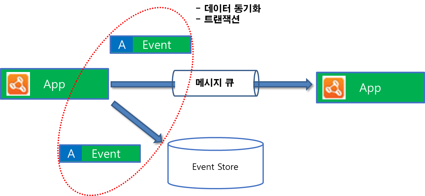 이러한 문제점을 해결하고자 메시지 큐를 사용해서 EventStore에 적재함과 동시에 큐에도 이벤트를 적재하여 전송하는 방법을 생각할 수 있습니다. 하지만 이는 EventStore에 저장과 큐를 통한 Event 전송 시점에 대한 동기화를 보장할 수 없습니다.