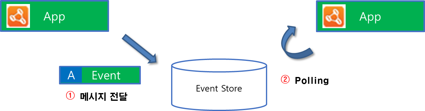 EvenetStore가 신규 추가된 Event를 희망하는 App에게 전파하는 역할을 수행하지 못한다면, Subscriber에서 주기적으로 Polling하여 Event 유입이 있는지 확인하는 작업이 필요합니다. 이는 DB 관점에서 I/O 및 Network 트래픽이 증가하는 요인입니다. 일반적인 RDBMS에서는 이벤트 전파기능이 없기 때문에 위 그림과 같이 메시징 처리를 수행해야합니다.