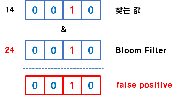 하지만 만약 집합속에 있는 값이 24라면, 해시 함수 결과 똑같이 4라는 결과가 나옵니다. 이때는 값이 다른데도 불구하고, 값이 있을 수도 있다고 판정하여 해당 집합을 읽습니다. 따라서 이러한 경우는 비효율적인 I/O가 존재하며 이를 false positive라고 합니다. 따라서 Bloom Filter에서는 false positive를 줄이기 위해서 bit 배열의 수를 늘리는 것과 해시 함수 개수를 늘려서 동일한 값이 발생하지 않도록해야 불필요한 I/O를 유발하지 않습니다.