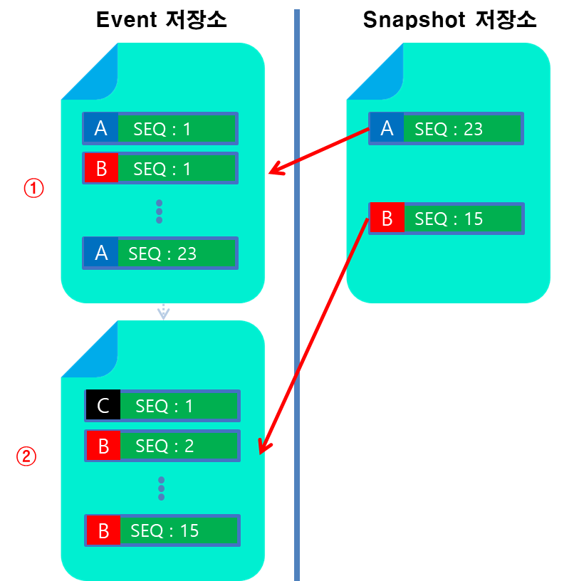 EventStore는 Snapshot 저장소를 제공합니다. Snapshot 저장소 또한 Segment 단위로 저장되며, Snapshot Entry는 동일한 Aggregate의 번호가 매핑된 파일을 가르킵니다. 따라서 위 그림에서 A Aggregate를 읽는다고 가정한다면 Snapshot이 가르키는 1번 Segment 이후부터 데이터를 읽기 시작합니다.