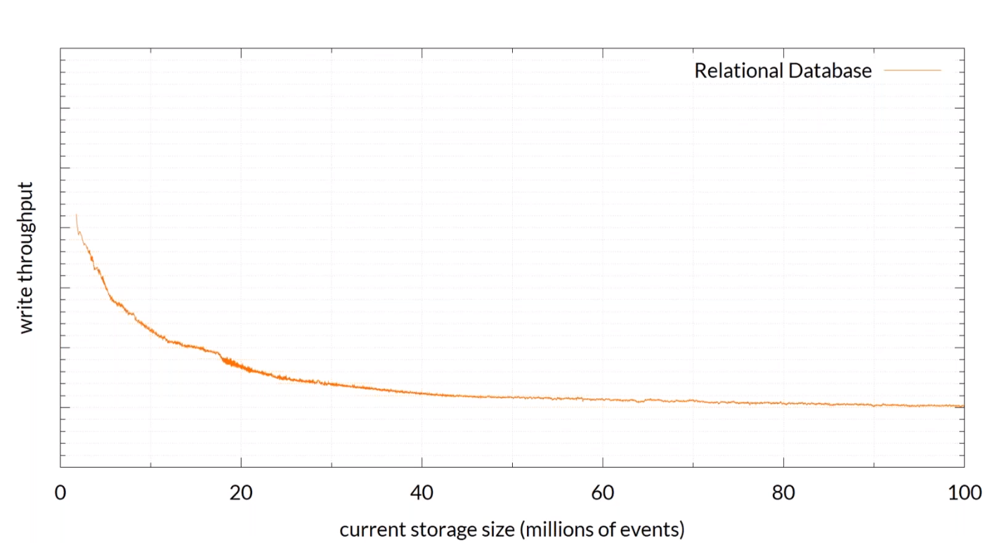하지만 가장 큰 문제점은 확장성입니다. 대량의 데이터 처리보다는 데이터 공간 효율화 및 관계를 통한 데이터 정합성 보장 등에 초점이 맞춰져 있습니다. AxonIQ에서 RDBMS를 EventStore로 사용했을 때의 벤치마크 테스트 결과는 다음과 같습니다.