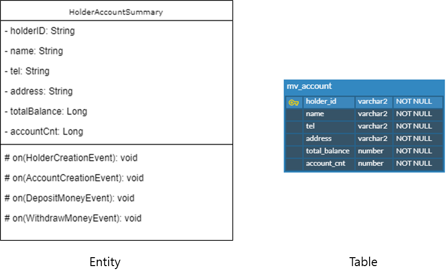 Command에서 발생된 Event를 적용하는 과정을 Projection이라 합니다. 먼저 설계 단계에서 도출한 Entity 구현 이후 Projection을 구현하겠습니다.