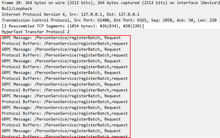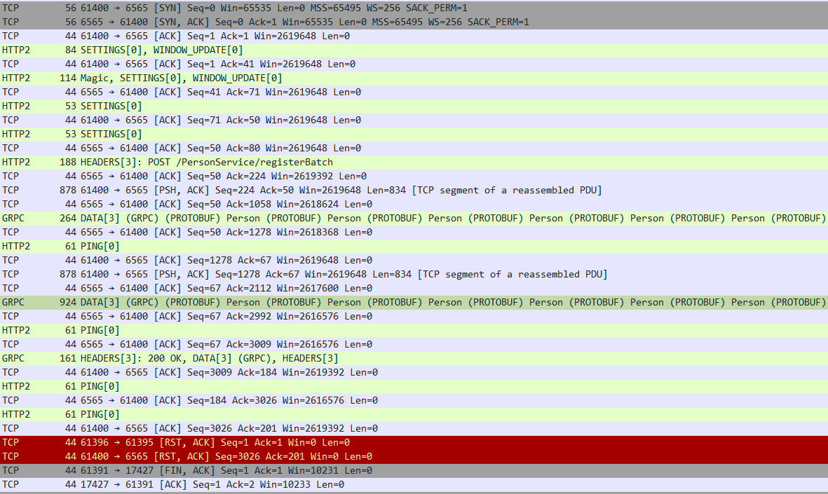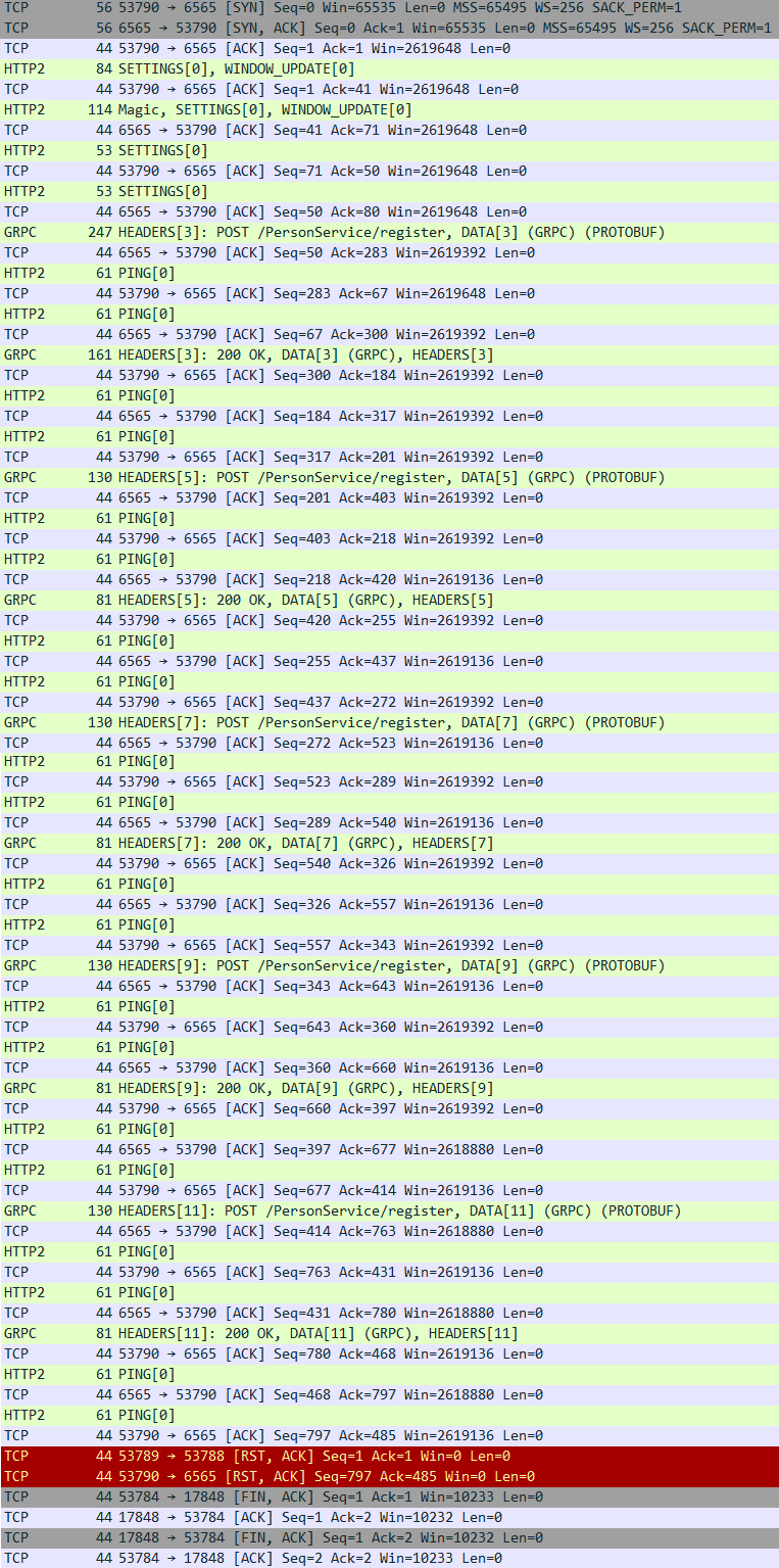 Unary와 REST 방식은 5회만 전송했는데도 많은 Network 요청이 있었던 것과 비교하여 50회 데이터를 전송했는데도 패킷의 횟수가 그리 많지 않습니다.
