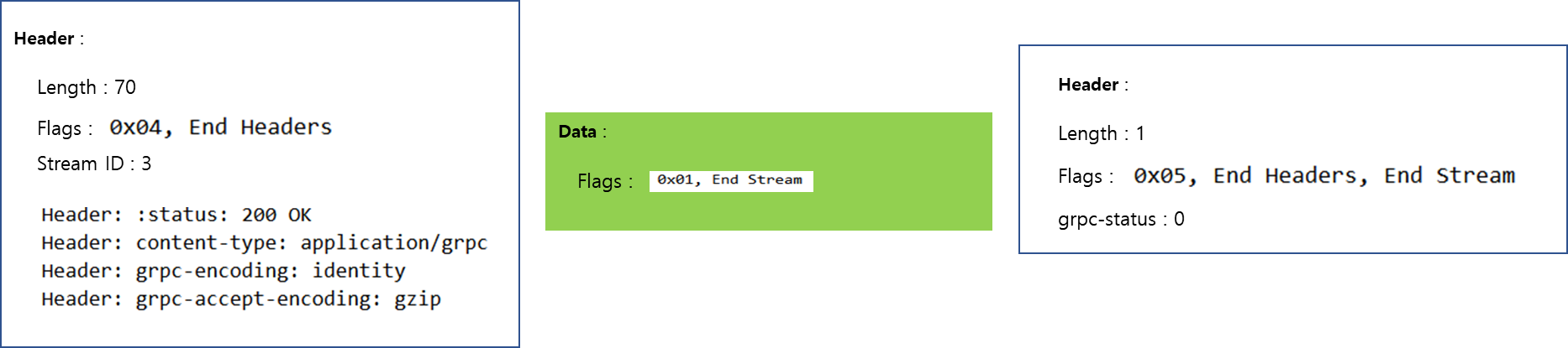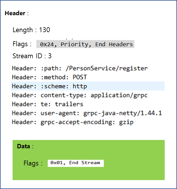 Data 영역에는 실제 전달되는 데이터와 Flag등을 전달합니다. Unary 통신의 경우 gRPC Stream 요청은 아니므로 Flag에는 End Stream으로 지정된 것을 확인할 수 있습니다.
