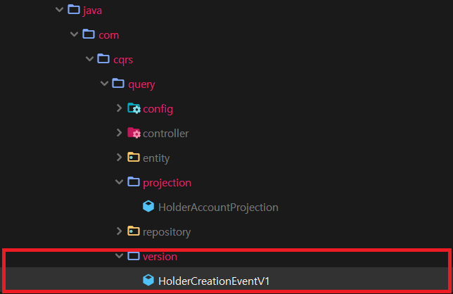 13. Query 모듈에 version 패키지를 생성한 다음 HolderCreationEventV1 클래스를 만듭니다. 해당 클래스는 변경 이전HolderCreationEvent에 대해서 변경 후에 어떻게 추가된 정보를 처리를 지정 용도로 사용됩니다.