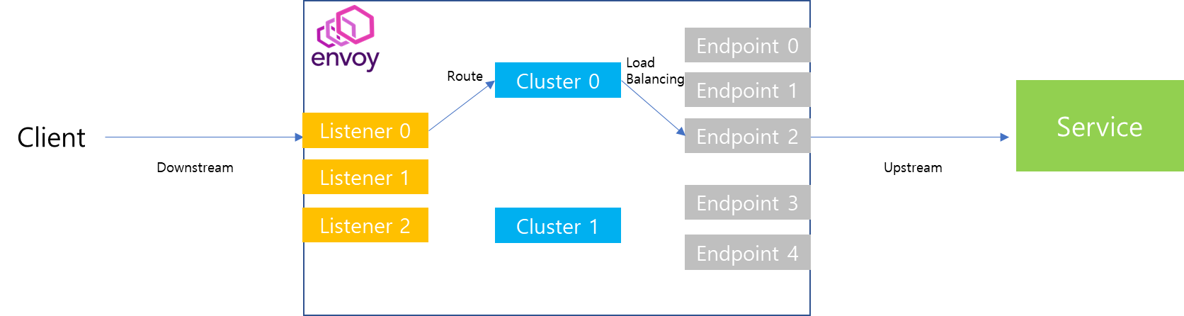 Envoy Proxy에서는 Cluster 컴포넌트를 통해 Endpoint들을 그룹핑하여 관리할 수 있습니다. 해당 컴포넌트를 통해서 Endpoint 중에서 어디로 트래픽을 보낼지 결정하는 Load Balancing을 결정할 수 있습니다.