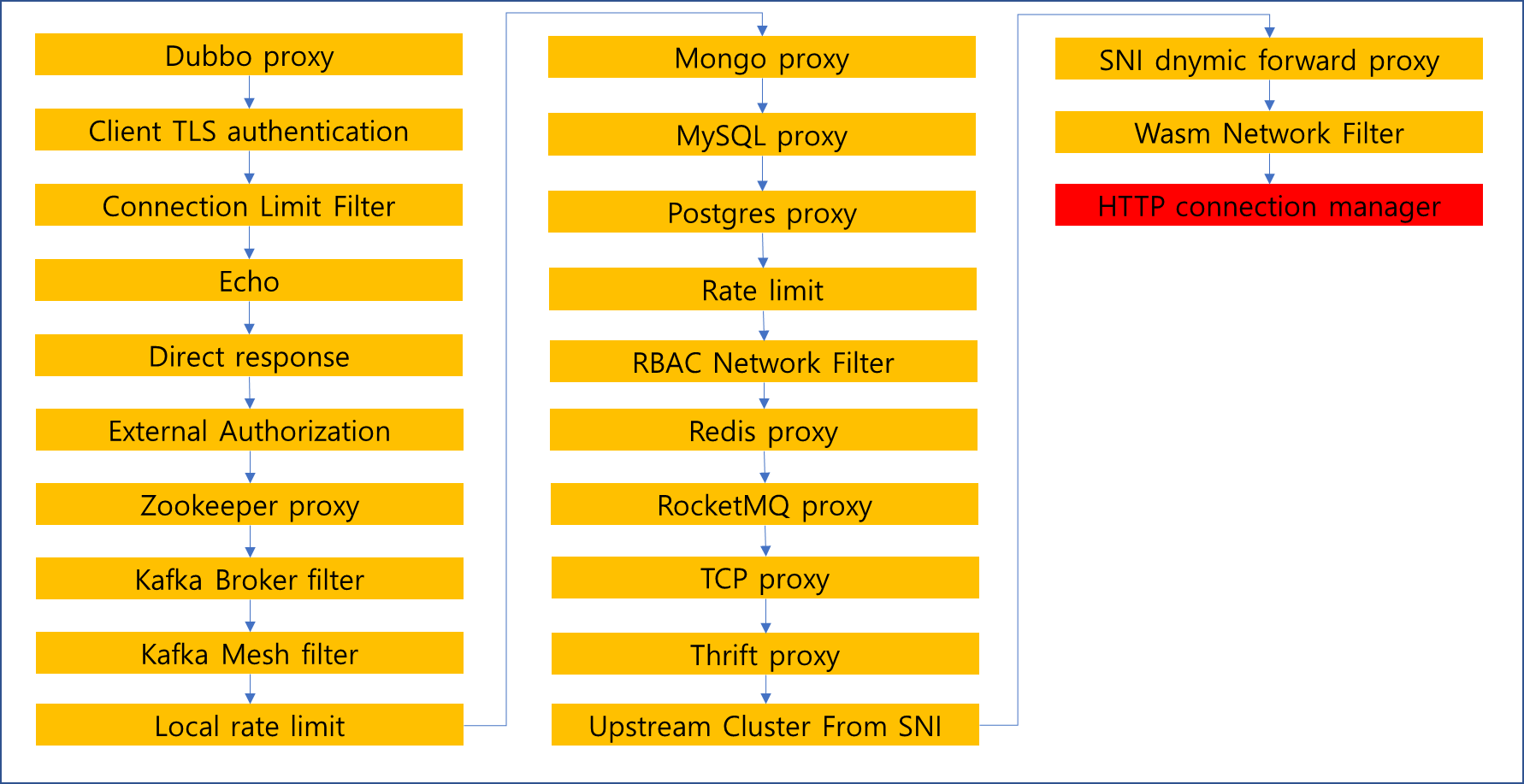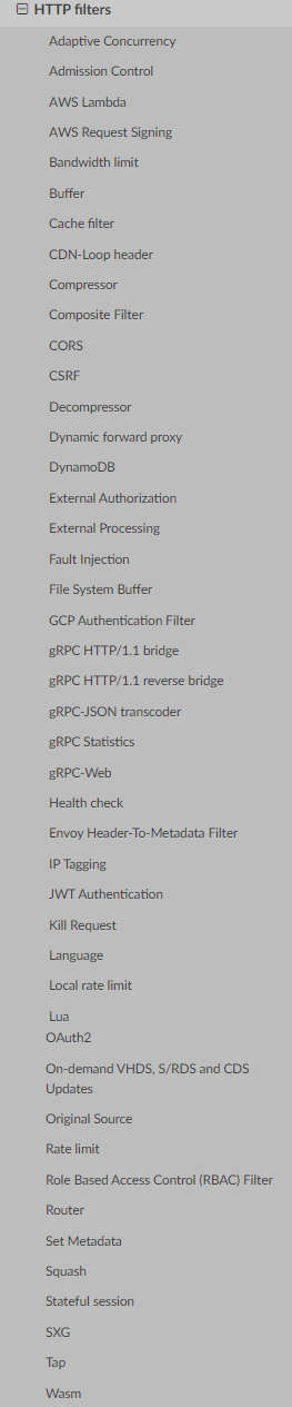 기본적으로 제공하는 FIlter Chains 목록은 위와 같습니다. 해당 항목들은 L3/L4 Filter 기능을 담당하며, 사용자 요청에 적합한 Filter를 찾아서 처리하고 목적지로 전달하는데 사용합니다. 만약 위 Filters 중 사용자 요청을 처리할 수 없는 경우에는 Envoy에서 제공하는 Default Chain이 사용되며, 만약 Default Chain 설정을 하지 않았다면 해당 Connection은 종료됩니다. 참고로 envoy proxy 기동시 위와 같이 모든 Filter가 등록되는 것은 아니며 순서 또한 다를 수 있습니다. 위 Filter 목록 중 필요한 Filter만 선별적으로 등록 가능합니다. 이에 대해서는 추후 살펴보겠습니다.