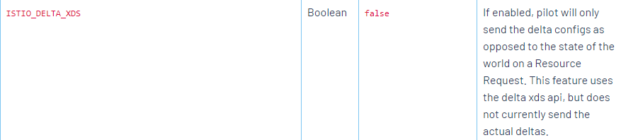 지금까지 gRPC 방식에서 Config 정보를 전달하는 두 가지 방법에 대해서 살펴봤습니다. 그렇다면 istio에서는 어떤 방식을 기본적으로 사용할까요? istio에서는 기본적으로는 SotW 방식을 사용하고 있으며, 사이드카 컨테이너를 주입할 때 사용자가 지정한 ISTIO_DELTA_XDS 값을 통해서 Delta 방식으로 변경할 수 있습니다. 하지만 현재는 값을 변경한다고 할지라도 실제 데이터를 전달할 때 Delta 값만을 전달하지 않습니다.