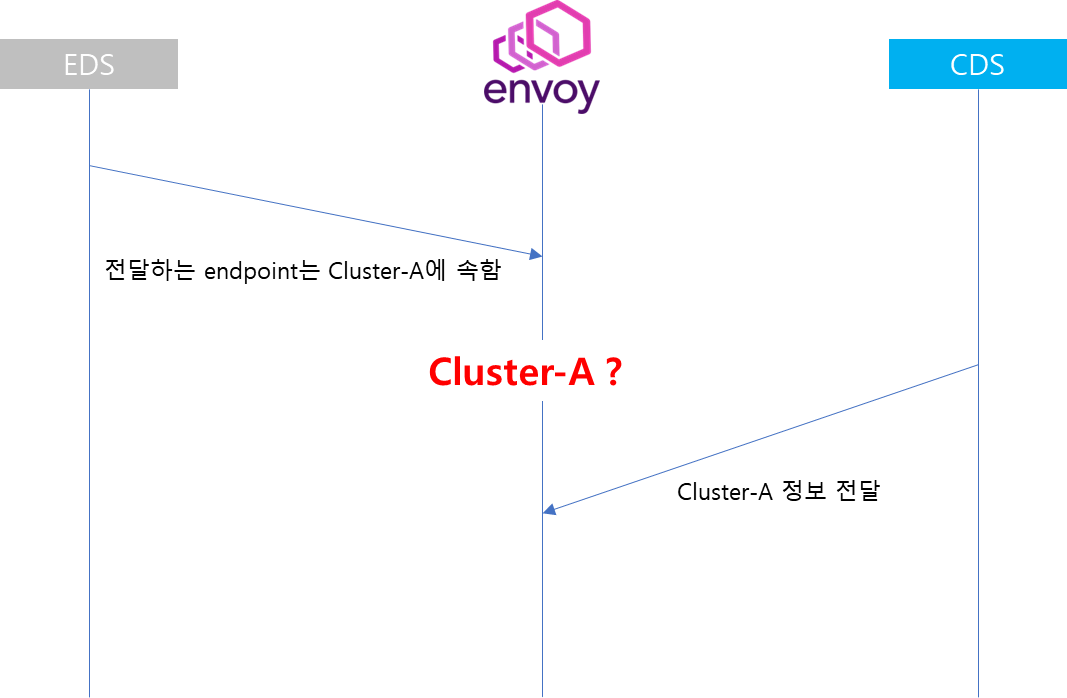 Envoy 입장에서는 EDS를 통해서 전달된 Endpoint의 대상이 Cluster-A라고 전달받았지만, 아직 CDS를 통해 Cluster 정보를 전달받지 못한 상황이므로 일정 기간 동안에는 Cluster 정보에 대한 동기화가 진행되지 않는 이상현상이 발생됩니다.