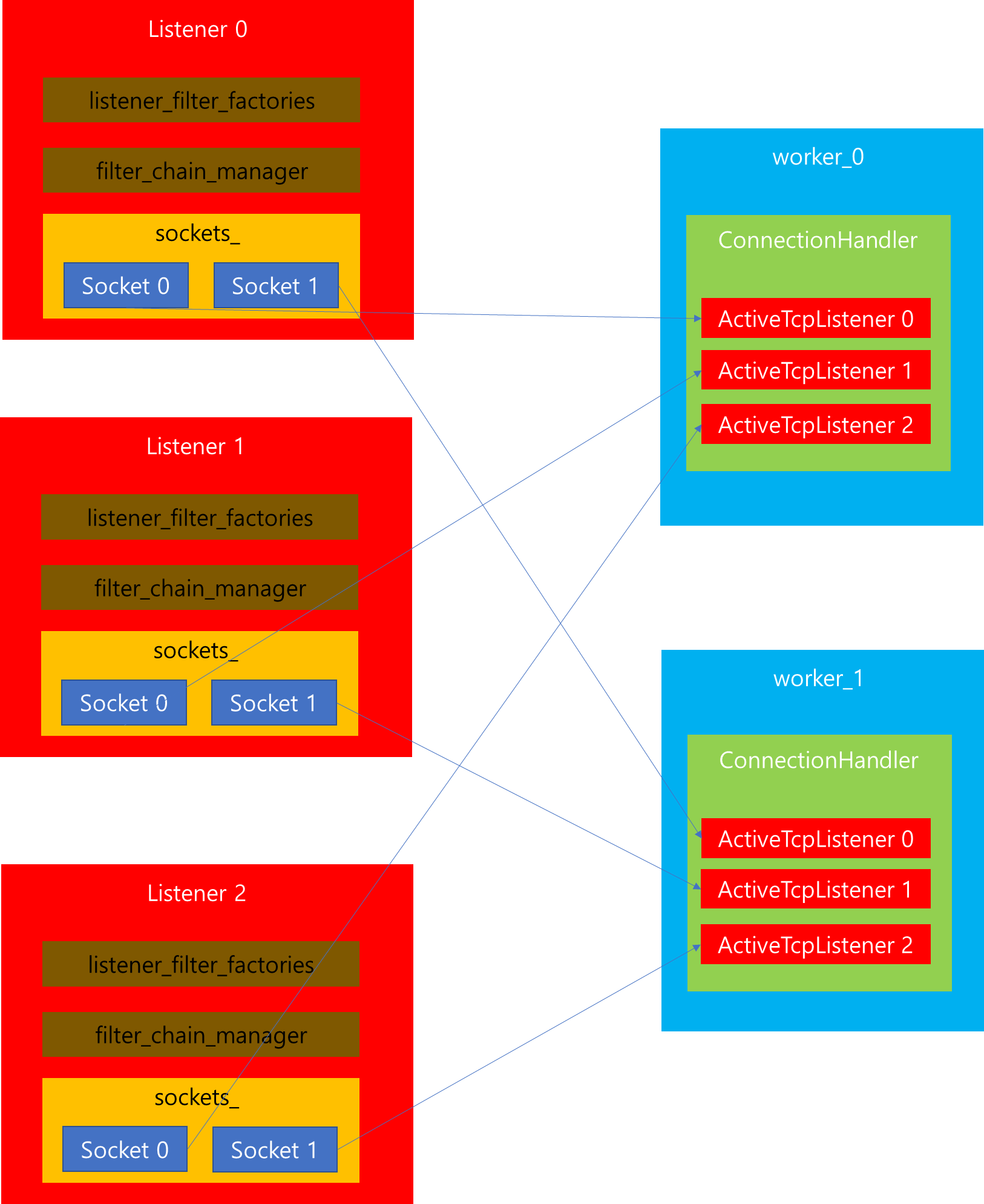envoy는 기동 당시 --concurrency 인자를 통해 생성할 Worker 쓰레드의 개수를 지정할 수 있습니다. 만약 위 그림과 같이 3으로 지정하였다면, 내부적으로는 3개의 Worker 쓰레드를 Listener Manager가 생성합니다. 또한 만약 Config에 지정된 Listener가 2개라면 위와 같이 2개의 Listener가 생성됩니다.