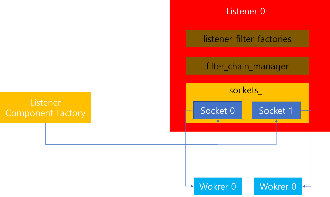 지금까지 listener 생성 과정에서 Listener Filters와 Filter Chains(Network Filters)가 생성되는 것을 살펴봤습니다. 그 밖에 중요하게 살펴봐야할 점은 Listener가 외부 요청으로부터 Accept 하기 위한 Socket을 생성한다는 점입니다. 그리고 생성되는 Socket의 개수는 --concurrency로 전달된 인자 개수 만큼 생성됩니다.