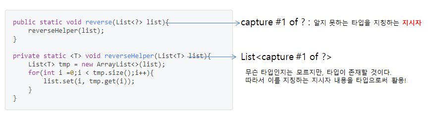 위 코드는 Helper 메소드를 사용하여 문제를 해결하였습니다. 즉 reverse 메소드를 호출할 때는 Wildcard Capture 정보를 타입 제약 조건으로 사용되지 않았습니다. 하지만 내부적으로 reverseHelper 메소드를 호출할때, 파라미터 타입에 T 타입을 명시하였기 때문에, capture# of ?와 같은 정보를 타입으로써 지정할 수 있습니다.