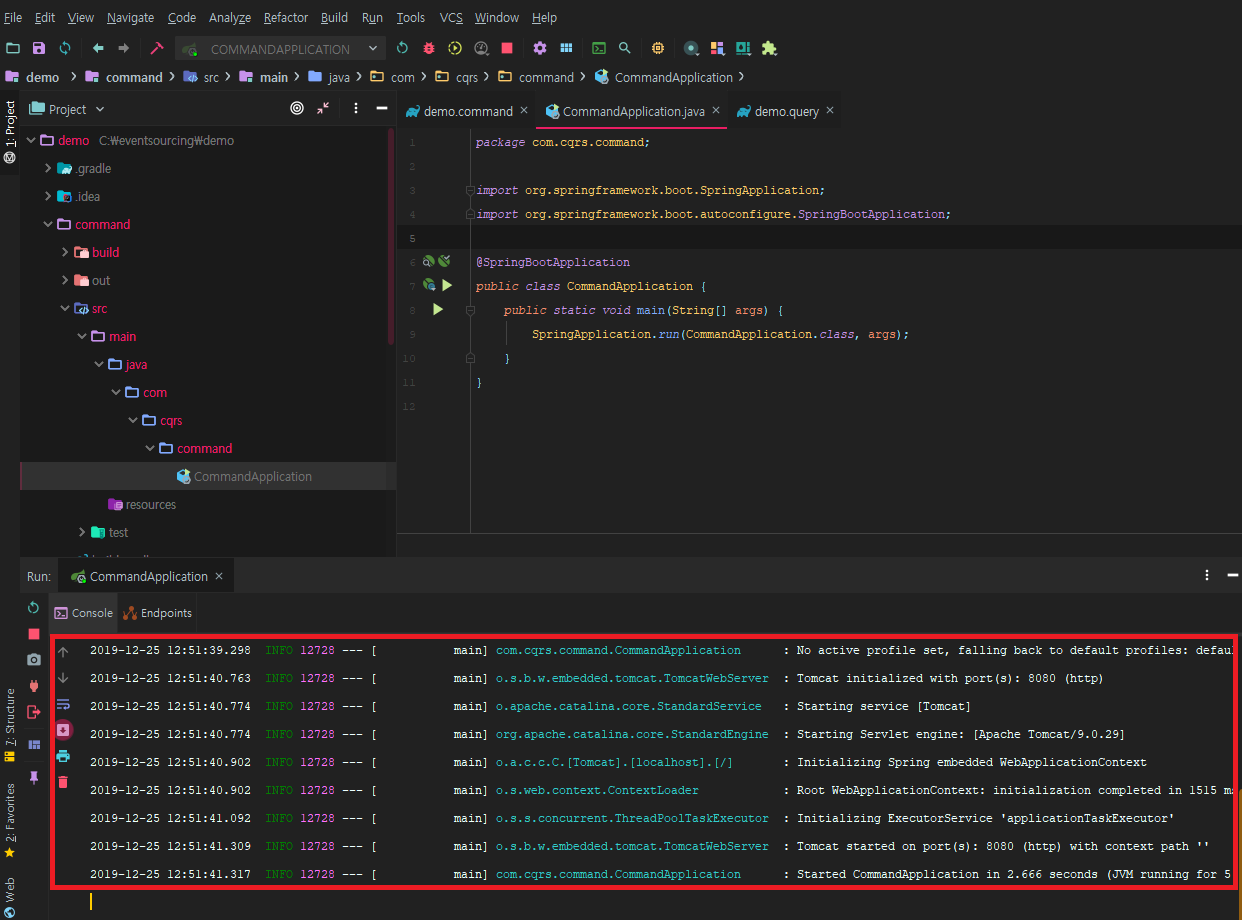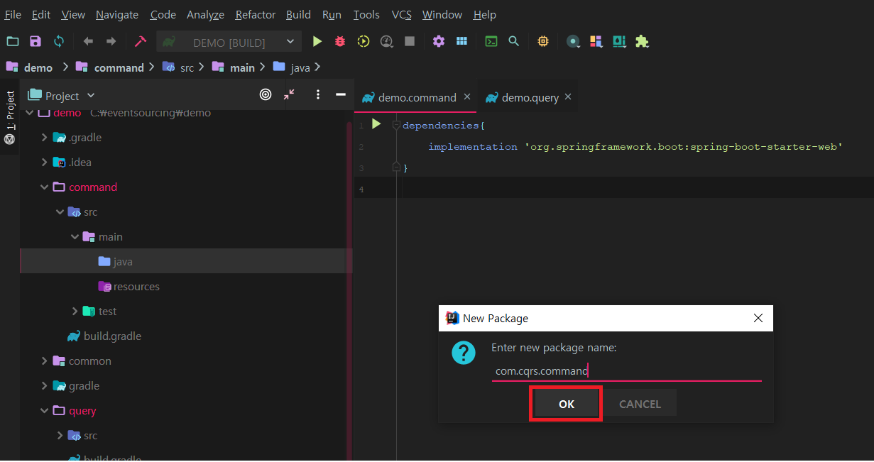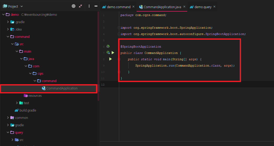 allprojects 블록 : root 프로젝트(demo)와 하위 프로젝트(command, query, common)에 모두 적용되는 빌드 스크립트 기준을 작성합니다.