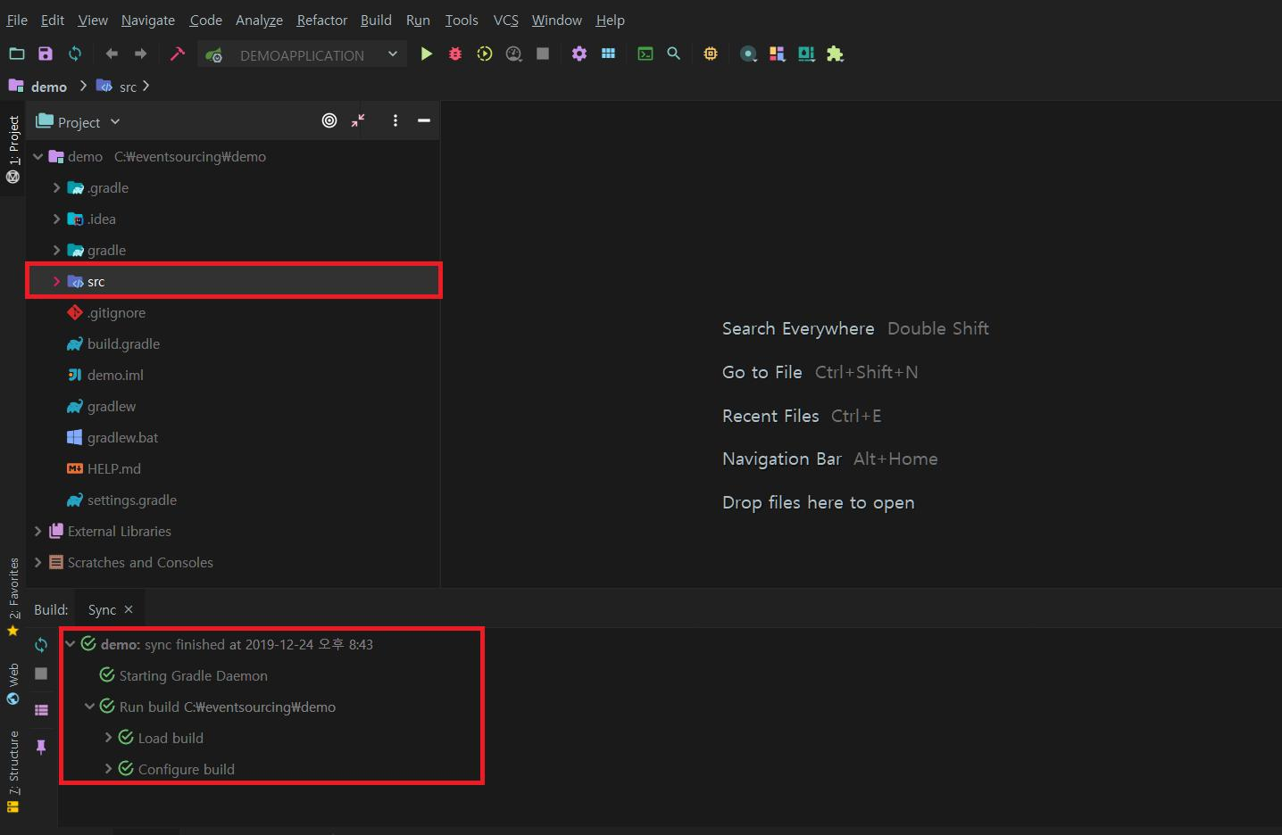7. 의존성이 정상적으로 추가되면 아래 이미지 하단과같이 sync가 정상적으로 이루어짐을 확인할 수 있습니다. 지금 생성한 프로젝트는 root 프로젝트이므로 src 폴더 전체를 선택 후 삭제합니다.