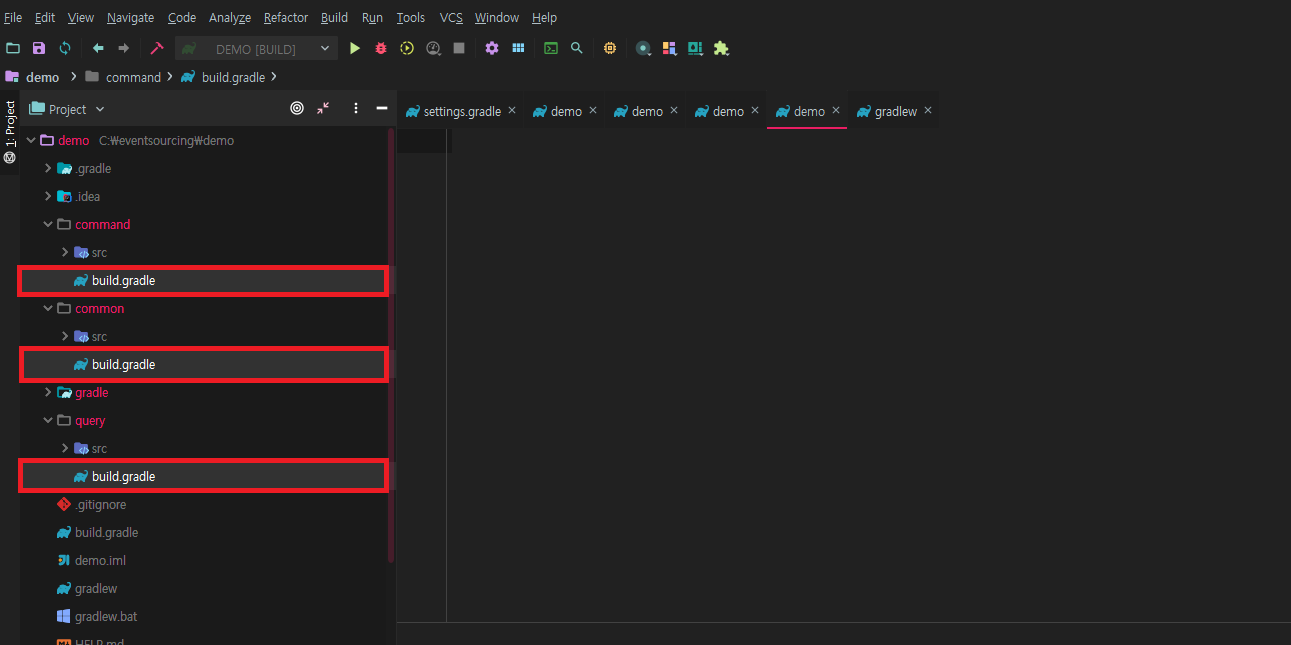 1. 프로젝트내 모듈은 3가지(Command, Query, Common)입니다. 따라서 이를 구성하기 위해서 root 프로젝트 내 settings.gradle 파일을 연 후에 아래 이미지와 같이 sub module명을 기입합니다.