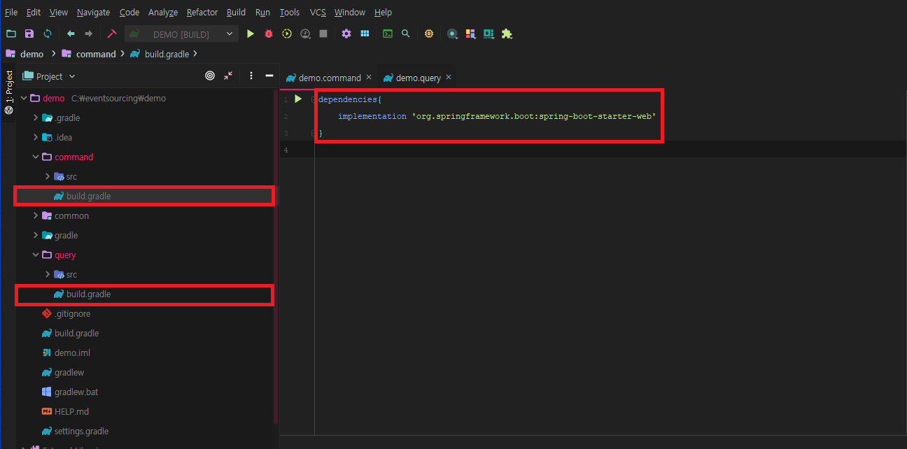 5. Command, Query App에서는 Spring Web MVC를 사용하기 때문에 build.gradle에 의존성을 추가합니다.