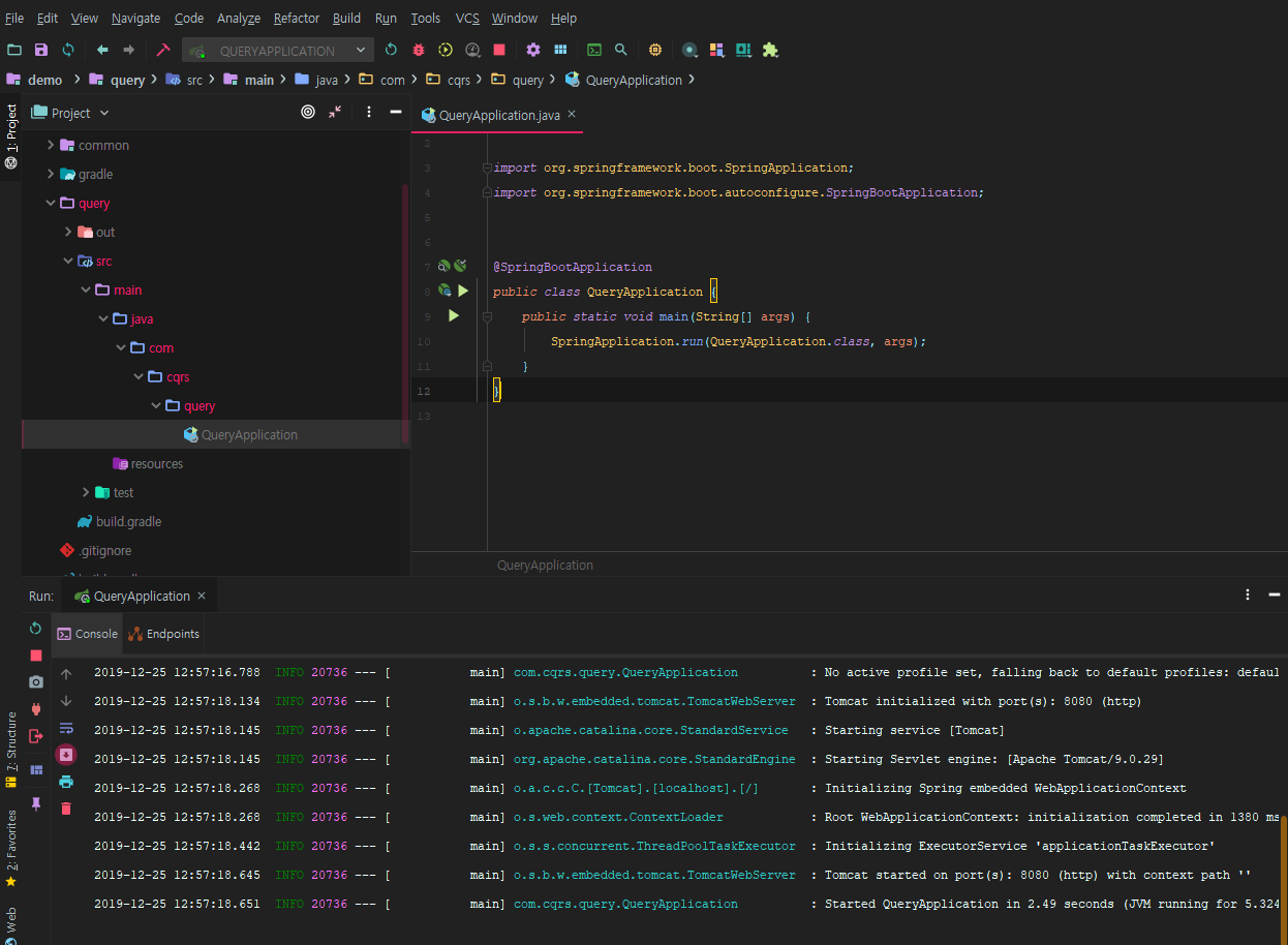 3. intellij 우측 gradle 탭을 엽니다. 이후 root 프로젝트 > Tasks > build > build를 더블클릭하여 build를 시도합니다. build 수행하면 root 프로젝트에 src 폴더를 지웠기 때문에 build 실패가 발생하지만, 좌측탭에 command, common, query 폴더가 생긴 것을 확인할 수 있습니다.