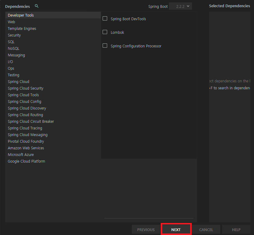 4. 의존성은 나중에 별도 추가할 예정이므로 Next 버튼을 눌러 다음 단계로 이동합니다.