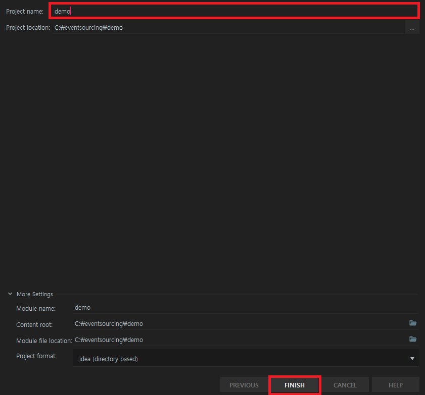 5. Project 이름 설정 후, Finish 버튼을 선택합니다.