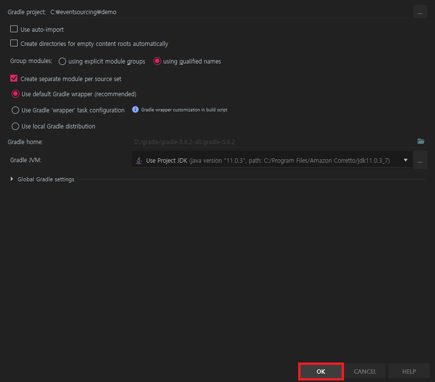 6. Gradle 설정 화면에서 특별하게 변경해야할 사항이 없다면 기본 설정 상태에서 OK 버튼을 선택합니다.
