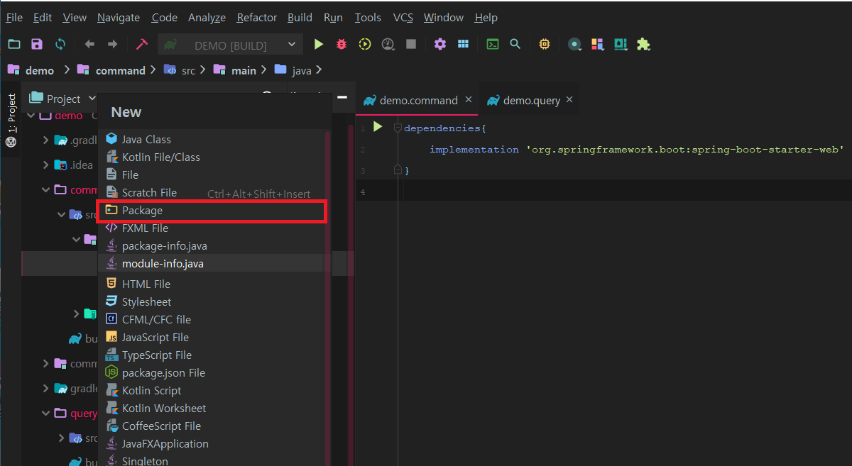 6. Command 모듈에서 패키지 생성을 위해 src > main > java 디렉토리 선택 후 [Alt + Insert] 키를 누릅니다. 이후 package 탭을 선택합니다.