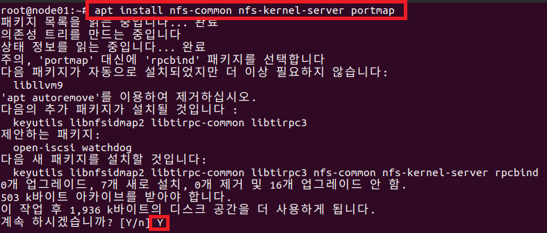 17. NFS 관련 패키지 프로그램을 설치합니다.(apt install nfs-common nfs-kernel-server portmap)