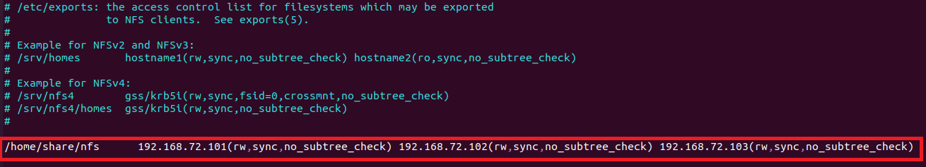 ( /home/share/nfs 192.168.72.101(rw,sync,no_subtree_check) 192.168.72.102(rw,sync,no_subtree_check) 192.168.72.103(rw,sync,no_subtree_check) )