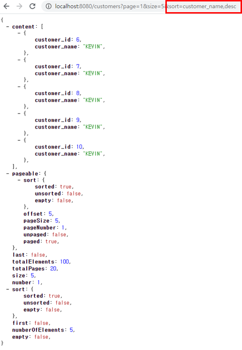 정렬 조건을 포함한 Pageable 객체를 CustomerSpec에서 가져올 수 있도록 구성하였습니다.