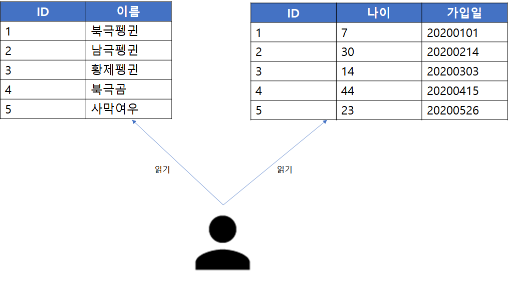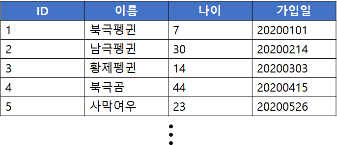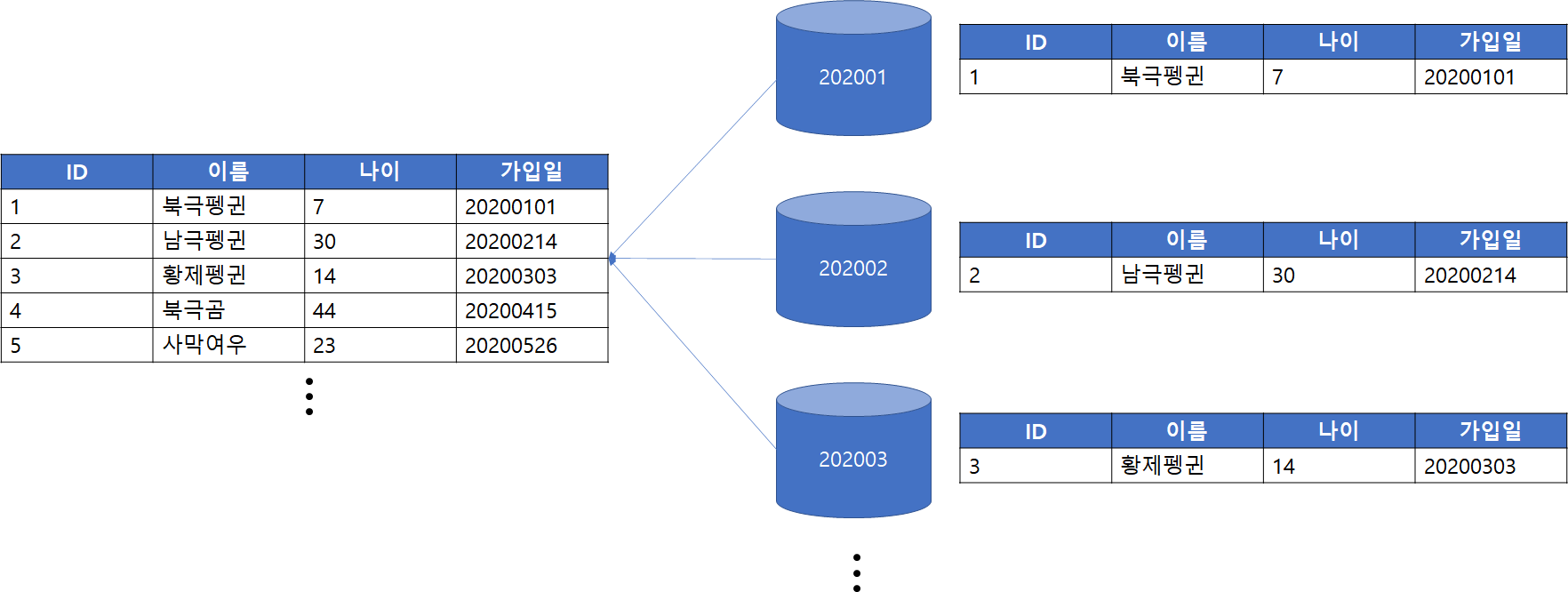 위 그림과 같은 회원 테이블이 존재한다고 가정해봅시다. 이때 가입자가 매일 증가하여 테이블 크기가 점점 커진다면, 해당 테이블에 조회 성능을 높이기 위해 인덱스 추가등의 작업이 쉽지 않을 뿐더러 점차 조회 성능도 떨어지게 됩니다.