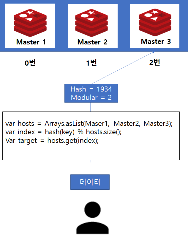 이때, Redis Key에 대하여 hash 함수를 적용한 결과가 1934라면 1934 % 3(서버 개수) 의 결과인 2에 해당하는 Master 3노드가 해당 Key의 저장소가 되며, 데이터를 조회할 때도 Client는 해당 저장소에서 데이터를 찾으려고 할 것입니다.