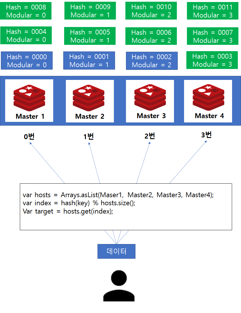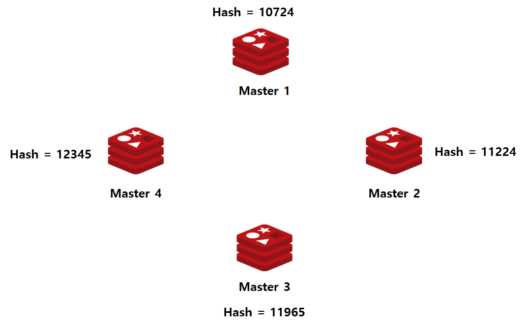 해시 파티셔닝은 Redis의 Key 값에 대하여 해시함수를 적용한 결과를 Redis Master의 개수만큼 나머지 연산을 토대로 데이터를 저장할 Master 서버를 지정하는 방법입니다.