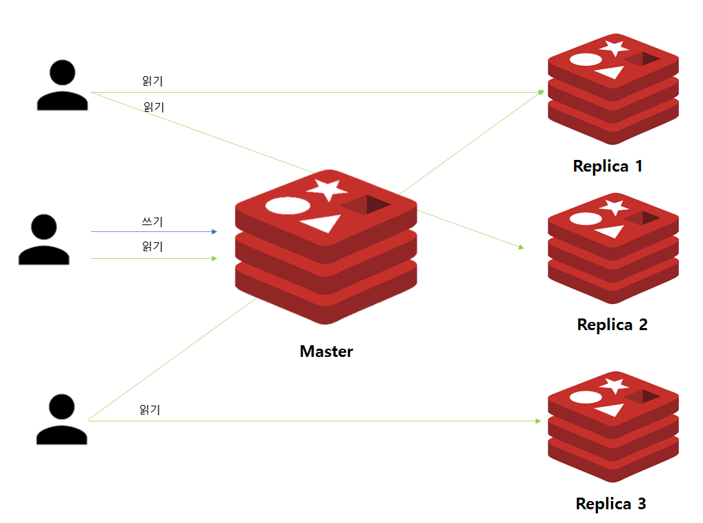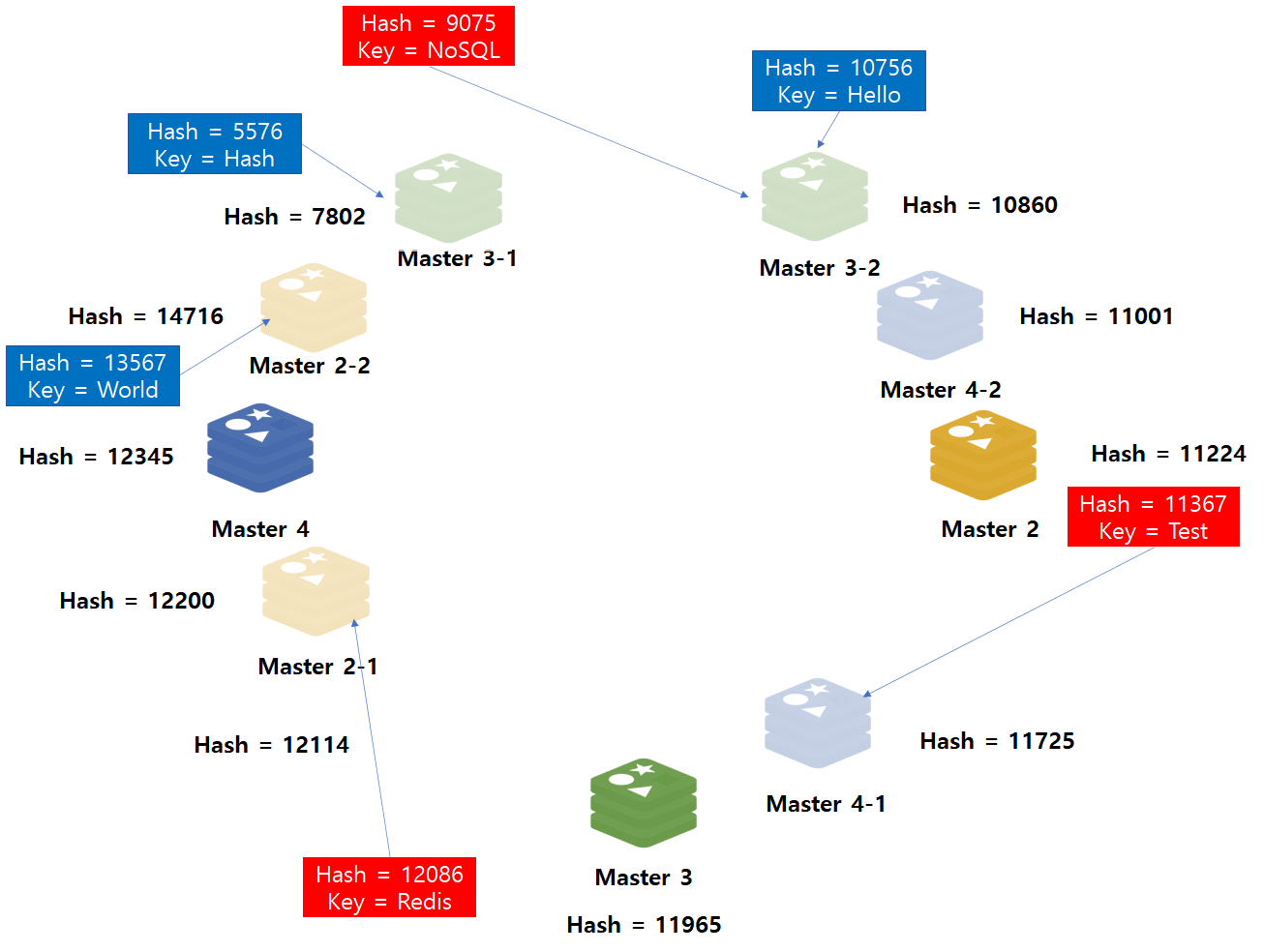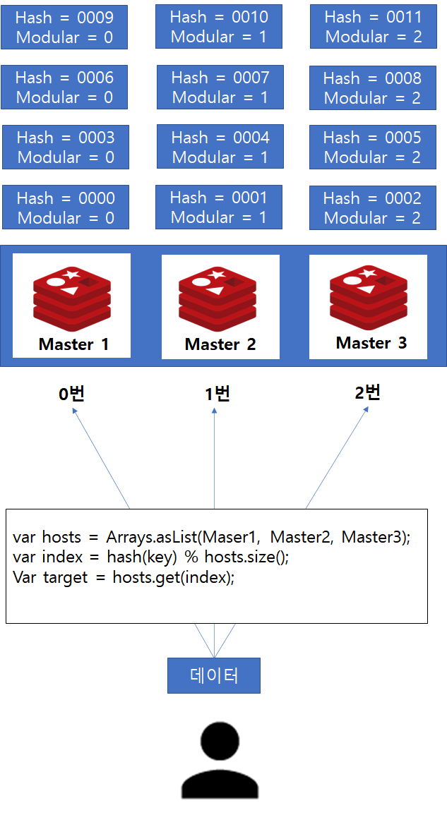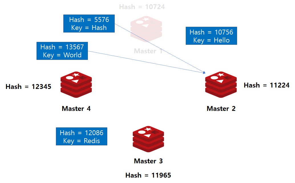 이때, Redis Key에 대하여 hash 함수를 적용한 결과가 1934라면 1934 % 3(서버 개수) 의 결과인 2에 해당하는 Master 3노드가 해당 Key의 저장소가 되며, 데이터를 조회할 때도 Client는 해당 저장소에서 데이터를 찾으려고 할 것입니다.