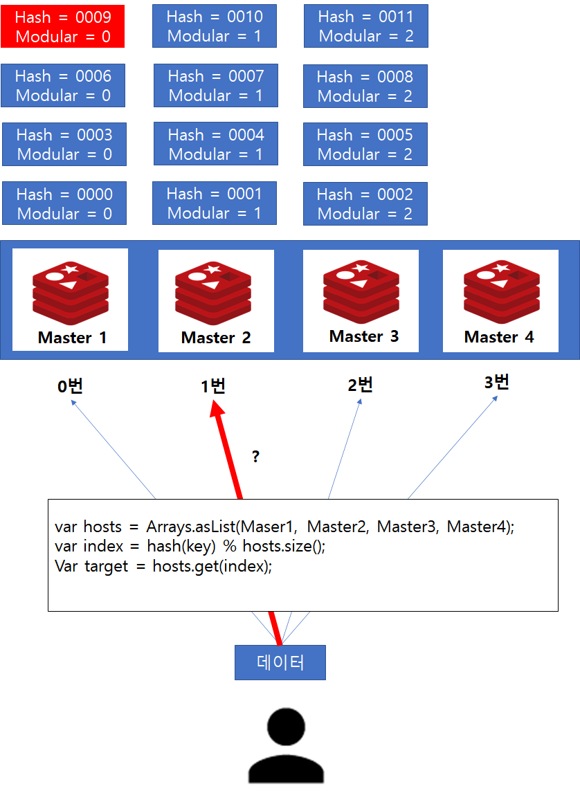 다음과 같이 hash 함수를 적용한 다음 Modulo 연산을 통해서 데이터를 저장하거나 찾아야할 Redis 노드를 지정할 수 있습니다.