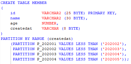 이전에 살펴본 예제는 가입일 컬럼 대상 특정 월을 기준으로 데이터 파티션을 나누었습니다. 이때 특정 범위를 기준으로 데이터를 분할한 파티션을 Range 파티션이라고 합니다.