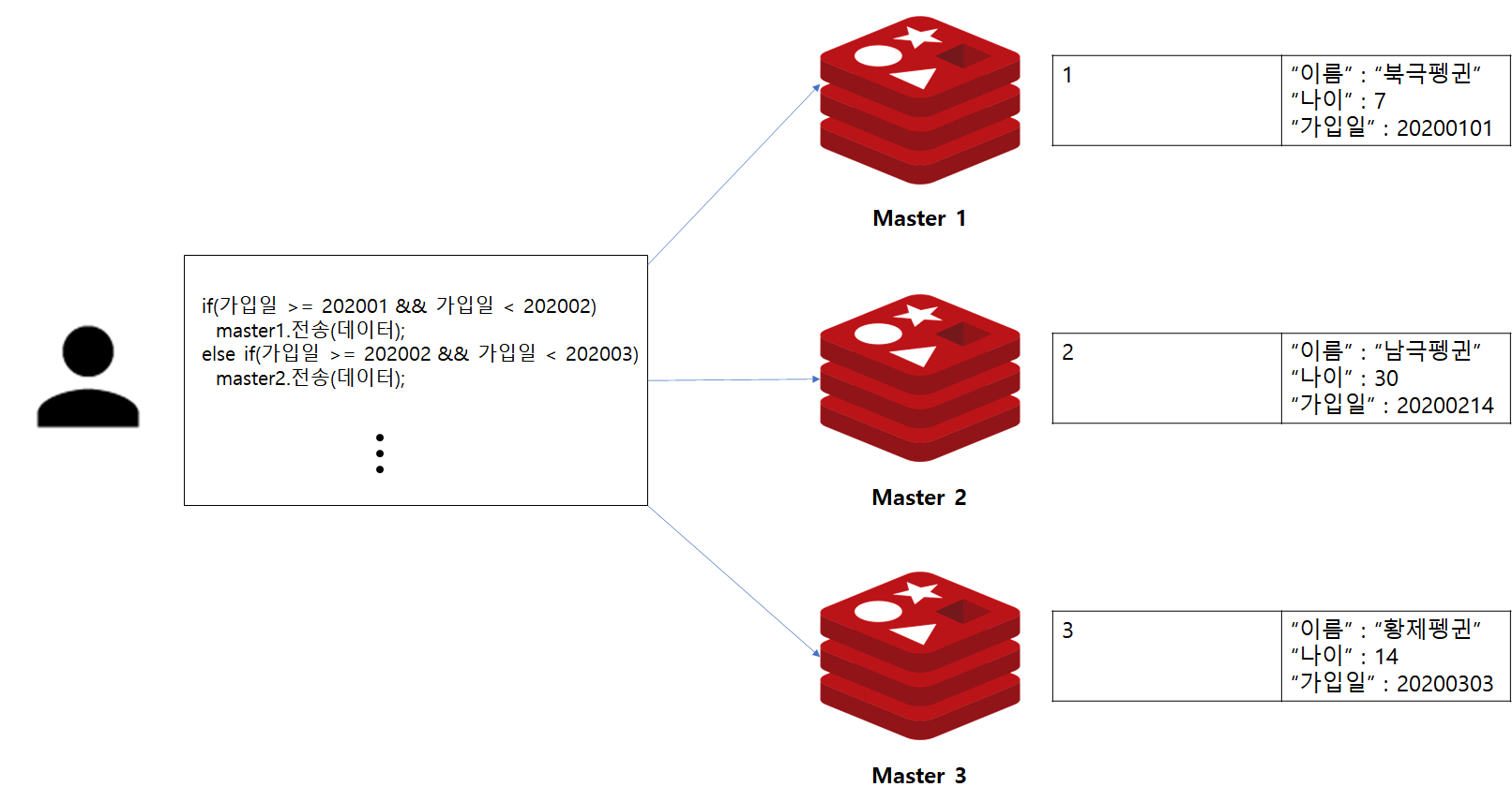 지금까지 RDBMS 테이블 구조로 Range 파티션 구조를 살펴보았습니다. 만약 Redis로 회원 데이터를 샤딩하면 어떤 모습일까요?