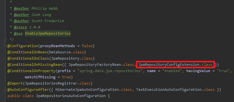 JpaRepositoriesAutoConfiguration은 JpaRepository 관련 자동설정을 하는데, JpaRepositoryConfigExtension 클래스가 Bean으로 등록되어있으면, 관련 자동설정을 하지 않습니다. @EnableJpaRepositories Annotation을 사용자가 지정했다면, 이전에 설명했듯이, JpaRepositoryConfigExtension가 Bean으로 등록되었기 때문에 자동설정을 하지 않습니다.