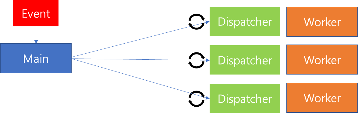 이 경우 가령 위 그림과 같이 Main 쓰레드에 Event가 발행할 경우 Main 쓰레드는 개별 Worker 쓰레드에 존재하는 Dispatcher에게 Event의 Callback 내용을 전달합니다. Worker 쓰레드에는 전달된 Event를 내부 Buffer에 저장하며, 저장된 Buffer에서 하나씩 Event를 추출하여 작업을 수행합니다.