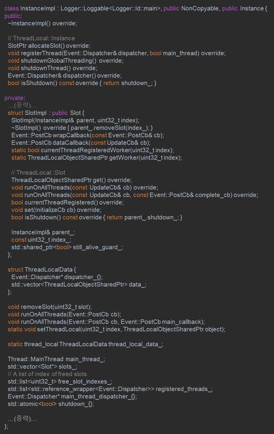 Envoy 내부에는 TLS를 관장하기 위해 InstanceImpl 인스턴스가 존재합니다. 이를 위해 해당 클래스 내부에는 TLS와 쓰레드간 상호작용을 위한 여러 메소드와 속성이 포함되어있습니다. 코드를 토대로 해당 클래스에 대해서 자세하게 살펴보겠습니다.