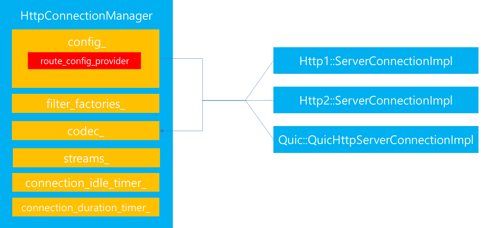 그림을 살펴보면, codec_은 HttpConnectionManager 내부에 있는 config에 의해서 생성할 수 있습니다. 이때 사용자의 Http 요청은 Http 1.1, Http 2.0 혹은 Http 3.0(Quic) 형태일 수 있습니다. 위 세가지 프로토콜 모두 HttpConnectionManager가 처리하는데요. 각각의 처리방식과 포맷이 다르기 때문에 사용자의 요청이 전달되었을 때, 가정 먼저 수행하는 일은 사용자의 요청이 어떤 프로토콜 형태인지를 파악하는 것입니다.
