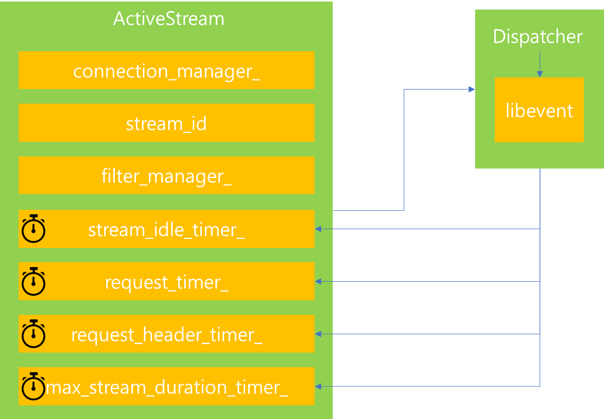 | stream_idle_timer_ | 해당 Stream이 연결되고 어떠한 활동도 일어나지 않았을 때, 지정된 idle 시간을 초과하면 Stream 해제 |