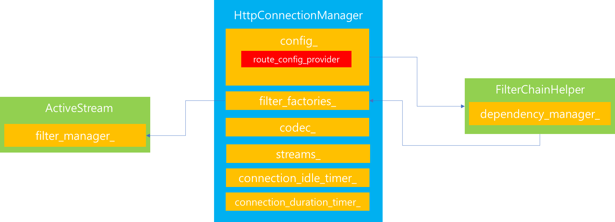 filter_manager_ 는 이전에 Http filter에 대해서 잠깐 살펴볼 때 등장한 프로퍼티명으로써, ActiveStream 내에 Http filter 생성 및 처리를 위임하는데 관여하는 프로퍼티입니다. 사용자 요청을 처리하는 과정에서 Http filter 처리가 필요한 순간에 해당 인스턴스가 사용됩니다.