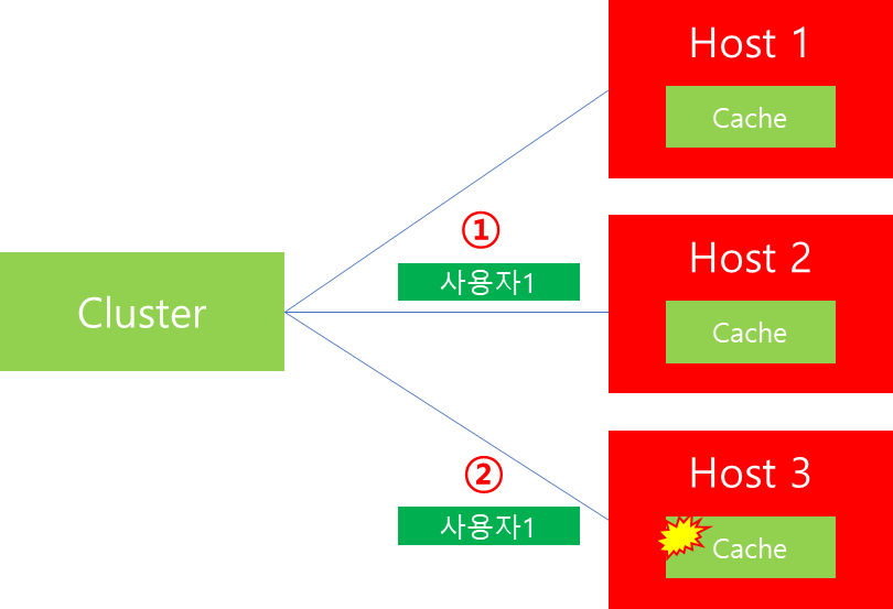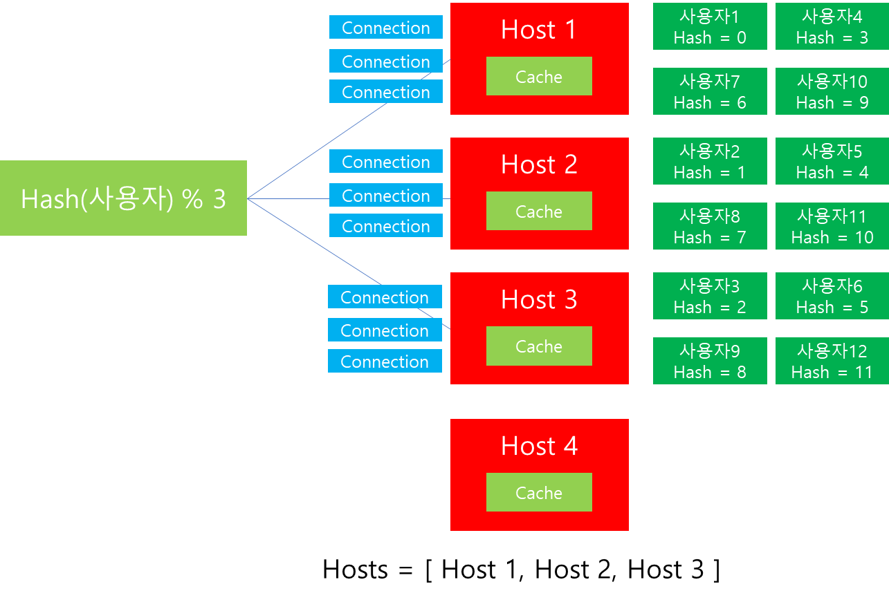 가령 위 그림과 같이 3개의 Host가 있고 각각의 Host에는 별개의 Cache 레이어가 존재하는 시스템이라고 가정해봅시다. 해당 시스템은 시스템 규모가 너무 커서 사용자별로 특정 데이터를 샤딩하여 각각의 Host 별개 Cache에 보관한다고 가정해봅시다. 이때 Cache Hit를 높이기 위해서는 특정 사용자 요청은 특정 Host로 보내져야 효율적일 것입니다.