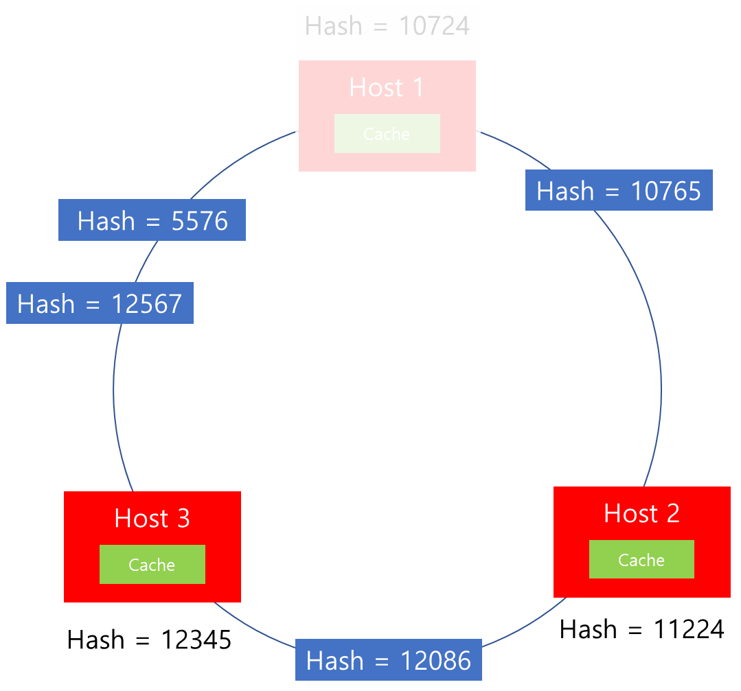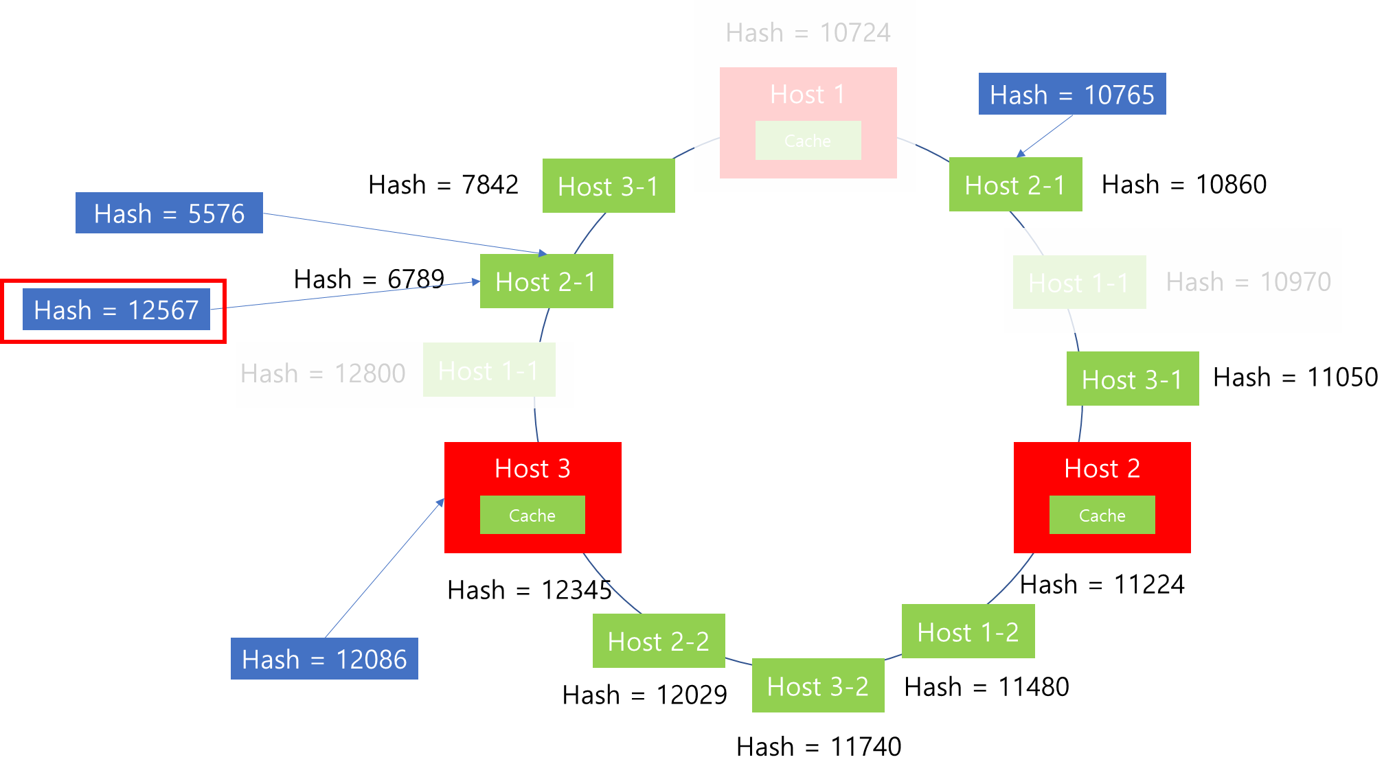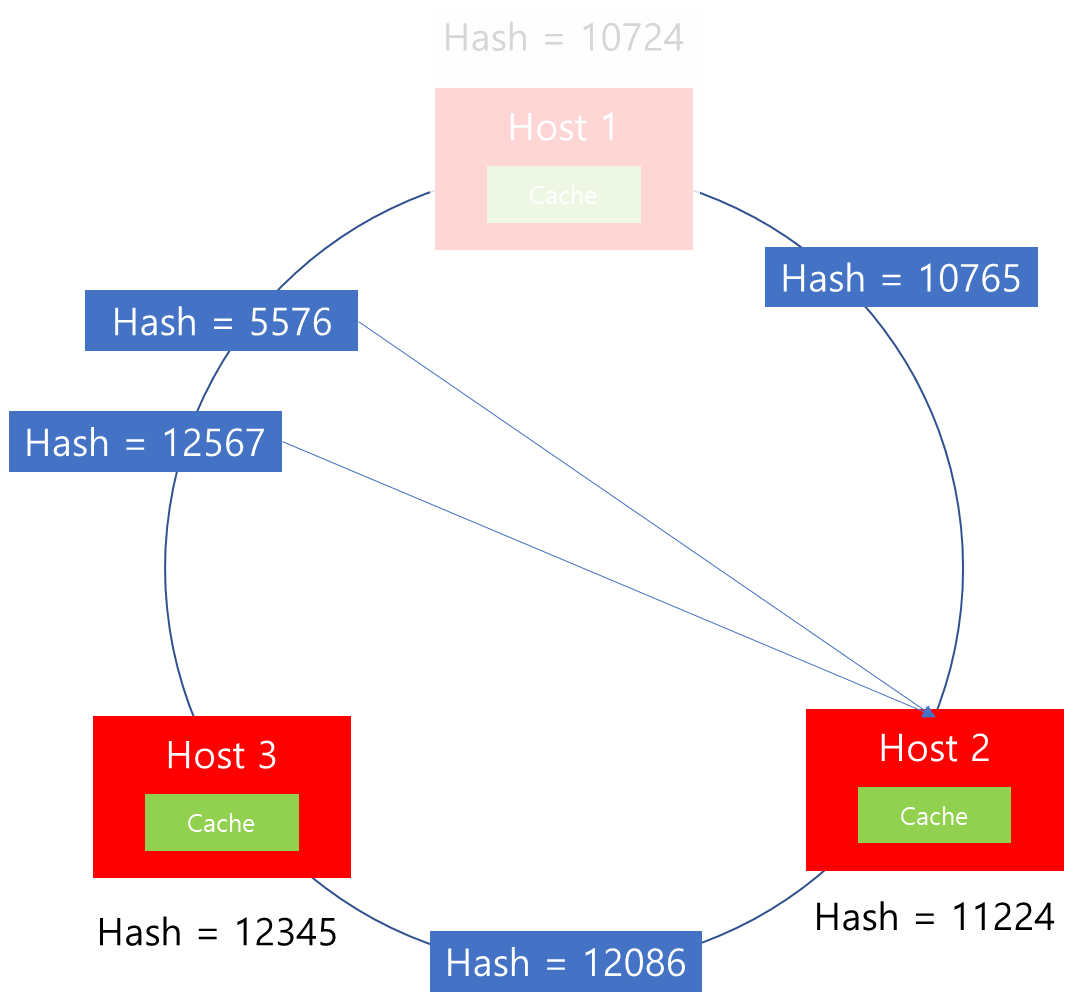 이후 지속적인 Connection 연결이 요청되었고 그 결과 위와 같은 모습이 되었다고 가정해봅시다. 위 그림을 살펴보면 Host 1은 해시값이 5576과, 12567에 해당하는 Connection이 연결된 상황이라고 볼 수 있습니다. 만약 이 상황에서 Host 1에 장애가 발생하여 Down되었을 경우 어떻게 될까요?