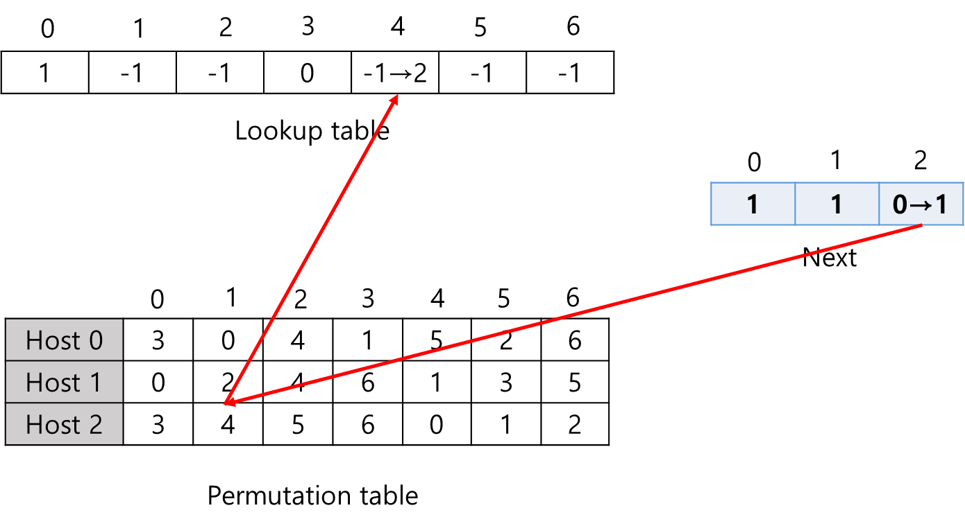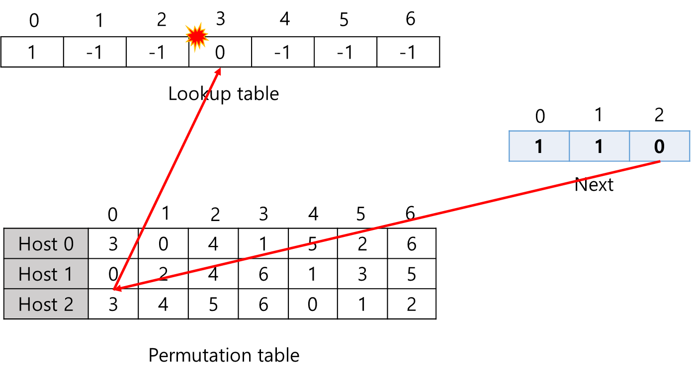 이 경우에는 Permutation table의 다음 index 참조를 위해 먼저 Next 배열에 저장된 값을 1증가시킵니다. 이후 Permutation table에서 증가된 index 위치를 탐색합니다. 결과를 살펴보면, 두 번째로 선호하는 자리가 4번 index이기 때문에 Lookup table에서 해당 index를 탐색합니다. 살펴본 결과 해당 값은 -1이기 때문에 선점이 가능합니다. 따라서 Lookup table의 4번 index는 Host 2에게 배정합니다.
