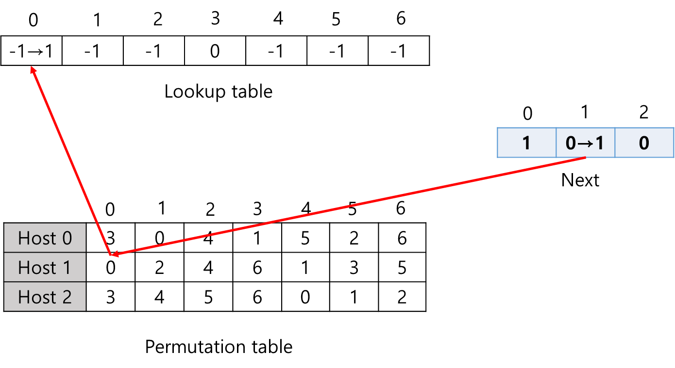 Host 0번이 매핑되었으므로 그 다음은 Host 1 차례입니다. Host 1의 현재 index가 0번이므로 Permutation table에서 해당 index를 살펴봅니다. 이때 Host 1은 Lookup table의 0번 index에 매핑되기 희망하므로 Lookup table의 해당 index를 탐색합니다. 살펴본 결과, 해당 index 값이 -1 이므로 선택될 수 있습니다. 따라서 Lookup table의 0번 index를 Host 1번의 값인 1로 갱신합니다. 또한 Next 배열에서 다음 값을 참조하기 위해서 1증가한 값으로 갱신합니다.