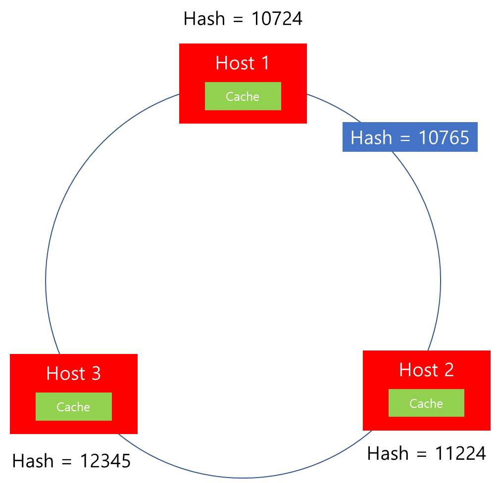 해당 해시값이 10765이므로, 이는 Host1의 데이터 범위인 10724 보다 크고 Host 2의 해시값 범위인 11224보다 작으므로 Host 2에 할당될 것입니다. 또한 이후에 동일한 해시값이 입력된다면 지속적으로 Host 2에 할당됨이 보장됩니다.