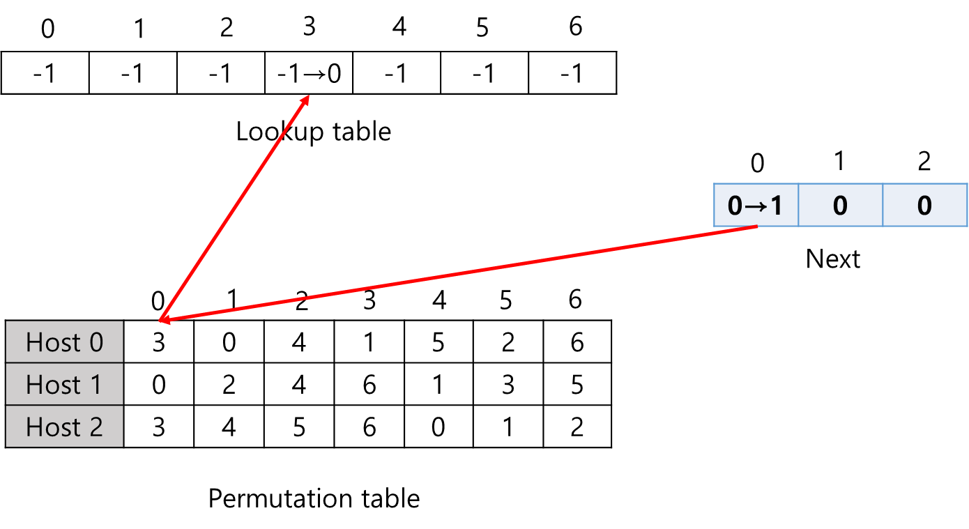 초기화가 완료되면, Host 별로 순차적으로 Lookup table을 갱신합니다. 먼저 0번 Host의 index가 현재 Next에서 0이므로 Permutation table의 0번 index를 살펴봅니다. 이때 Host 0은 Lookup table의 3번 index에 매핑되기 희망하므로 Lookup table의 해당 index을 탐색합니다. 이때 Lookup table에 해당 값이 -1 즉 아무 값도 매핑되지 않은 상태이므로 갱신이 가능합니다. 따라서 해당 index를 Host 0번 서버의 index인 0번으로 갱신합니다.