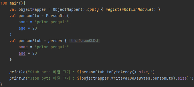 사이즈 크기 비교를 위해 작성한 프로그램은 위와 같습니다. 이전 내용과 같이 PersonDTO와 Stub 객체를 생성 후 둘 다 byte 배열로 변환한 크기를 출력하도록 구성했습니다.